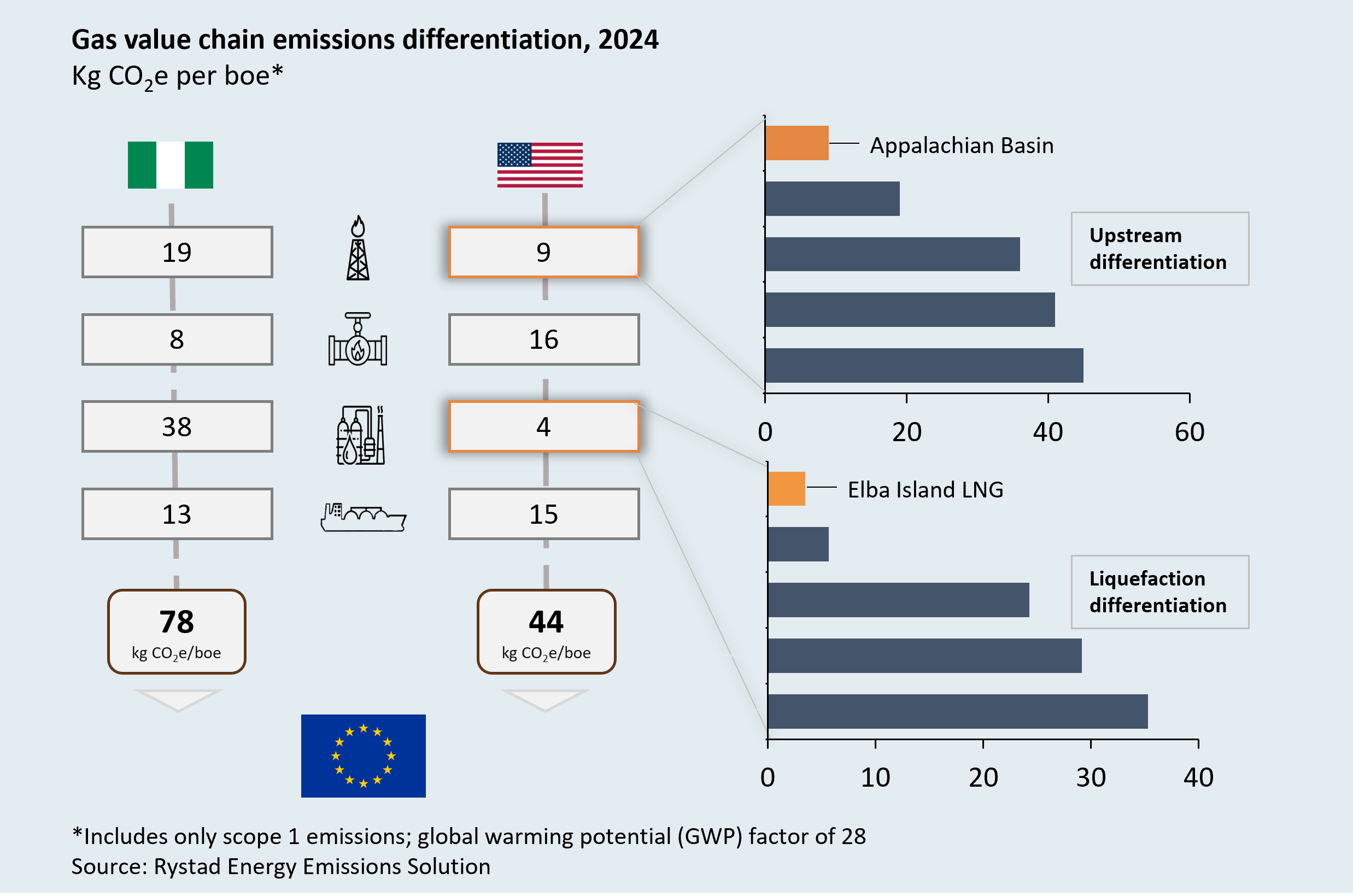 The variation in emissions across traded molecules is substantial. For LNG delivered to Europe, average cargo intensities from Nigeria and the US are broadly similar at around 78 and 80 kilograms of CO₂ equivalent per barrel of oil equivalent (kg CO₂e/boe) respectively. But underpinning those averages is significant differentiation: US LNG cargoes range from as low as 44 kg to more than 100 kg CO₂e/boe depending on the upstream basin, liquefaction facility and transport chain involved. Upstream methane intensity alone can vary by more than 40 kg CO₂e/boe between key supply basins.