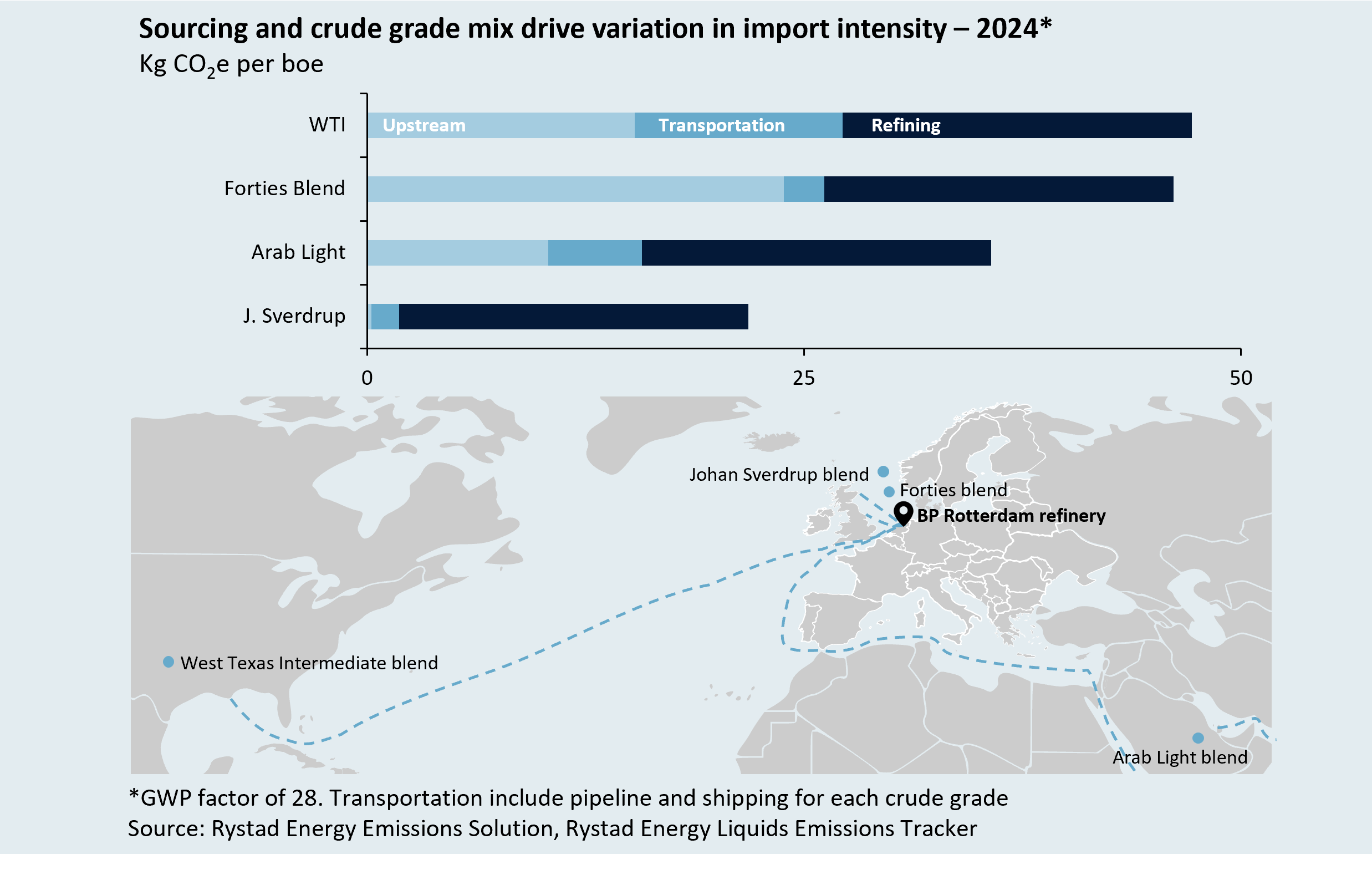 Crude oil flows present their own complexity. Unlike natural gas, crude varies significantly in composition, and each grade must be matched to specific refinery configurations. Even when processed at the same facility, barrels from different origins exhibit markedly different emission profiles. Sourcing Johan Sverdrup crude instead of West Texas Intermediate for delivery to the same European refinery can reduce pre-refining emissions by roughly 25 kg CO₂e/boe, driven by electrified upstream operations and shorter transport distances.