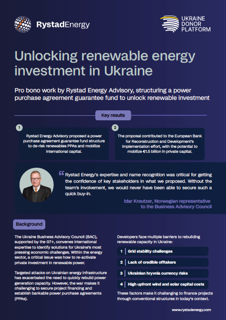 Rystad Energy Advisory worked pro bono with the BAC to design a PPA guarantee fund that reduces risk for renewable PPAs and helps mobilize international capital. The recommended structure, supported by donor funding and aligned with key Ukrainian industry associations, contributed to the European Bank for Reconstruction and Development’s implementation effort. Once in place, the mechanism is expected to unlock up to €1.5 billion in renewable energy investment. Learn more about how Rystad Energy and the BAC advanced this solution in our latest case study.