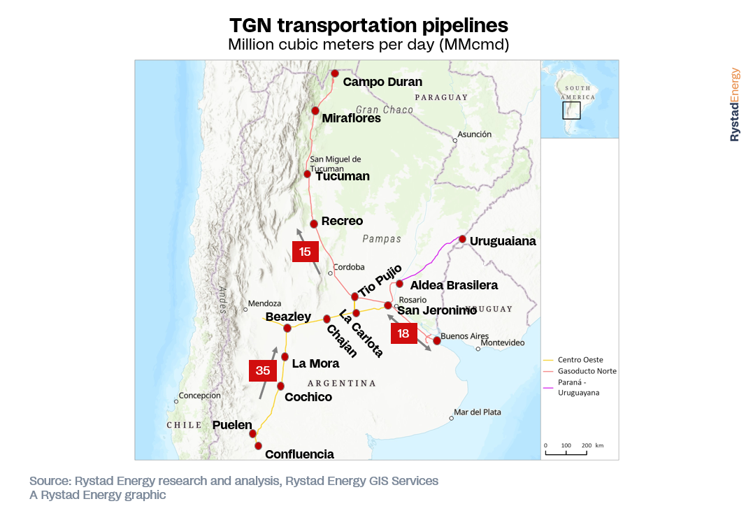 Transportadora de Gas del Norte (TGN) is one of Argentina’s main natural gas transmission companies, operating a strategic pipeline network connecting production areas in the Neuquen and Northwest basins to core domestic demand centers and export routes. The system plays a crucial role in evacuating Vaca Muerta gas volumes, thereby supporting national supply security and regional gas flows.