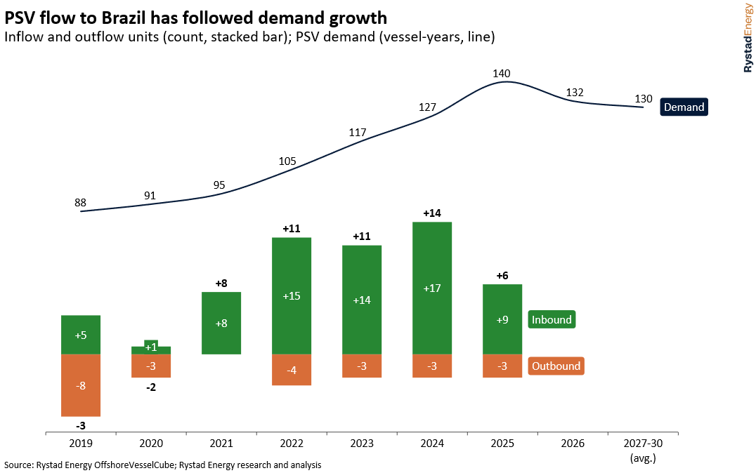 Brazil recorded 69 inbound mobilizations and 24 outbound departures of PSVs between 2021 and 2025 – a cumulative net increase of 45 PSVs. Inbound activity was particularly strong in 2022-2024, in line with robust demand growth of 10% each year. Last year was an inflection point as the net inflow shrank to six vessels, the lowest year of growth in that period. This coincided with Brazil's PSV demand peaking, with an anticipated decline to 132 vessel-years this year and projected stable demand in the second half of the decade. Even with the reduction, Brazil remains the third-largest PSV market globally, trailing only the North Sea (167 vessel-years) and the Gulf of America (152 vessel-years).