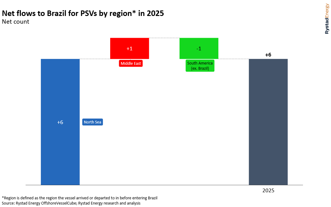 Last year saw a particularly strong inflow of vessels to Brazil from the North Sea, with a net six units taking the trip from northern Europe – a reflection of the significant day rate difference between both regions.