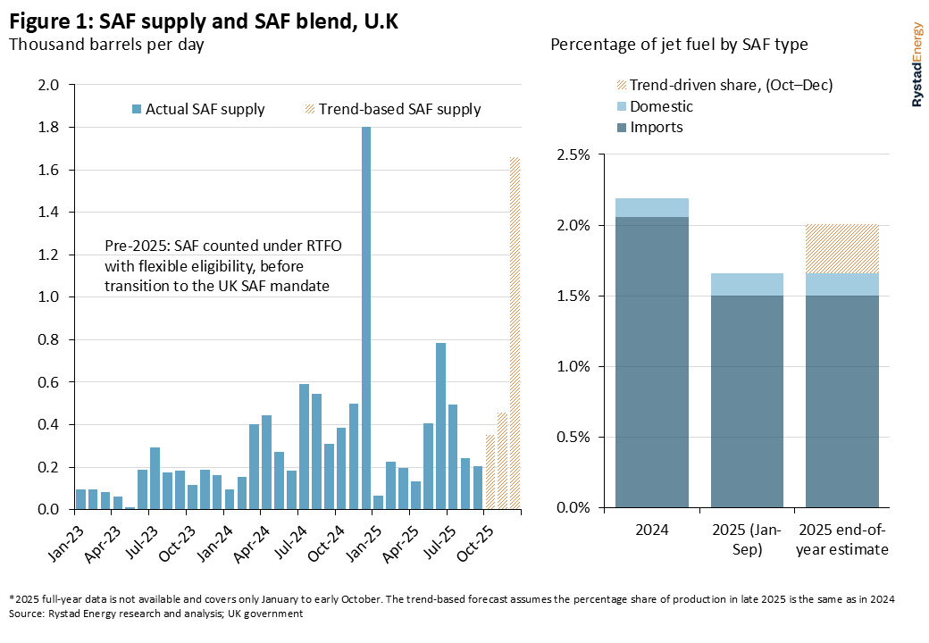 By 2030, the UK is poised to have one of the most advanced and diversified SAF pipelines, with HEFA constrained by the mandate's cap and policy support tilting investment toward next-generation pathways. Domestic production should expand beyond today's co-processing volumes, but imports are still likely to cover a large share of supply, given the gap between risk-adjusted capacity and mandated demand. In the first compliance year, DfT data from January to early October this year points to an around 1.6% SAF blend, suggesting a potential shortfall unless year-end certifications and late-year deliveries lift the full-year total toward the 2% target. Even so, the UK remains among the earlier adopters of mandated SAF blending, with the next test being whether domestic projects progress fast enough as the HEFA cap tightens and PtL obligations begin.