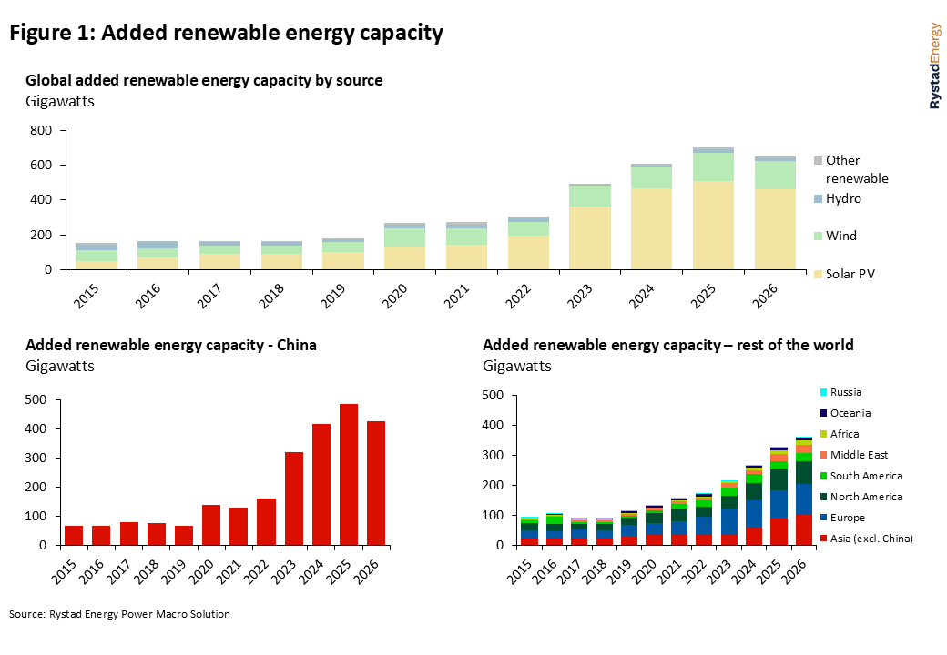 Renewable energy capacity growth is expected to slow down for the first time since the technological boom in the early 2000s. Renewable energy capacity growth reached a new record last year with the commissioning of 703 gigawatts (GW). This was largely driven by new solar photovoltaic (PV) capacity coming online in China during the first half of the year. It is estimated that the country commissioned close to 300 GW of solar capacity in 2025, representing more than half of the solar capacity installed globally. Local developers were keen on getting their projects operational before a change in China’s power pricing policy for renewables came into effect on 1 June.