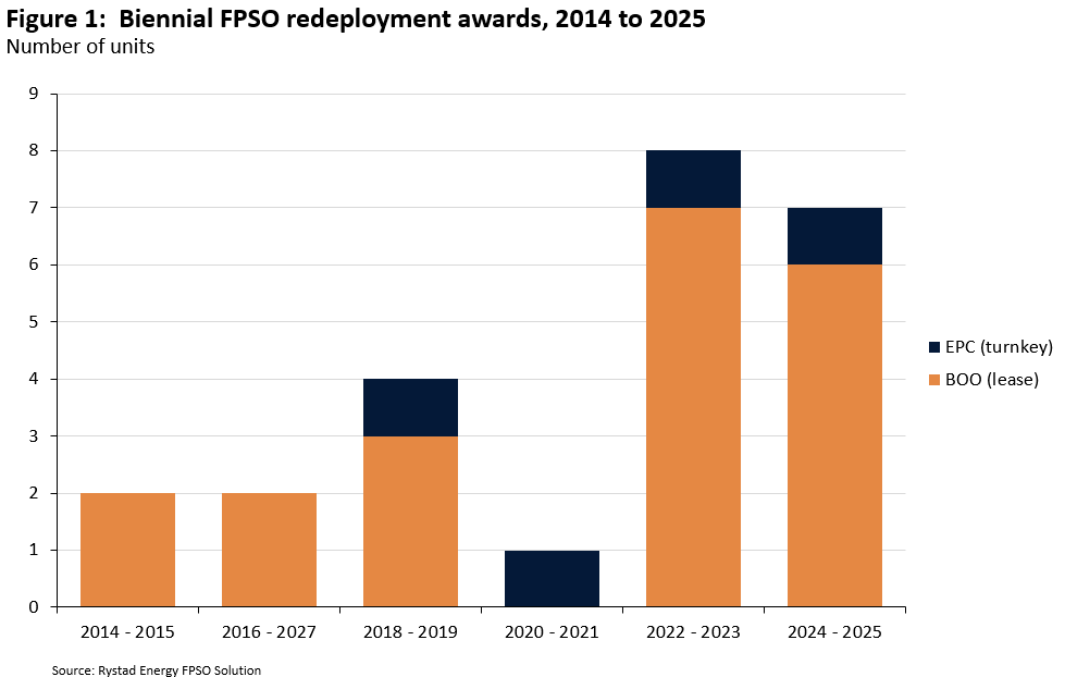 Among the redeployed units, most platforms were leased and moved to a new location following refurbishment and modifications. Around seven projects are expected to be awarded by the end of next year using existing FPSOs, some with pre-selected units such as Maromba, Polok and Avalon deployed in Brazil, Mexico and the UK, respectively.
