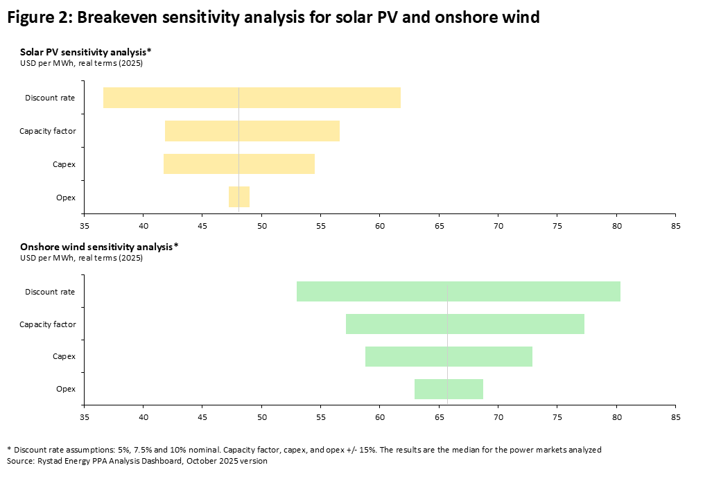 PPA prices are primarily defined by two factors: the costs of the projects and the power market prices where the project will be located. Solar PV and onshore wind projects generally have a much higher capital expenditure (capex) than operating expenditure (opex), and capex is therefore the main driver of project breakeven, together with the capacity factor, which determines the generation level, and together with the offtake price determines the revenue for the project.