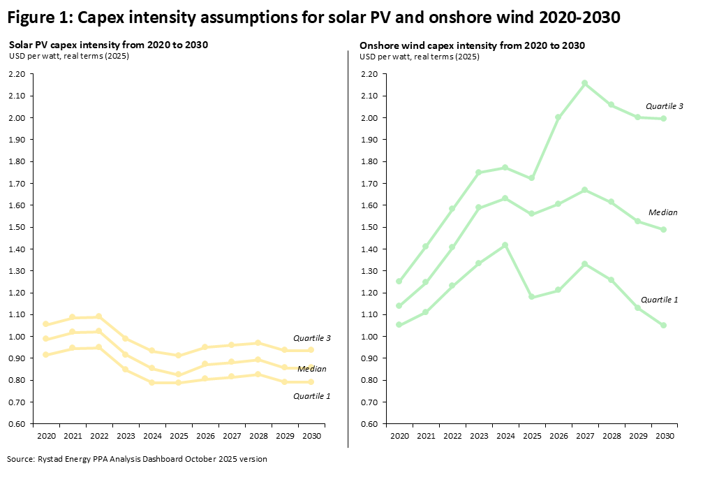 Higher capex intensity with a large geographical spread for onshore wind compared to solar PV