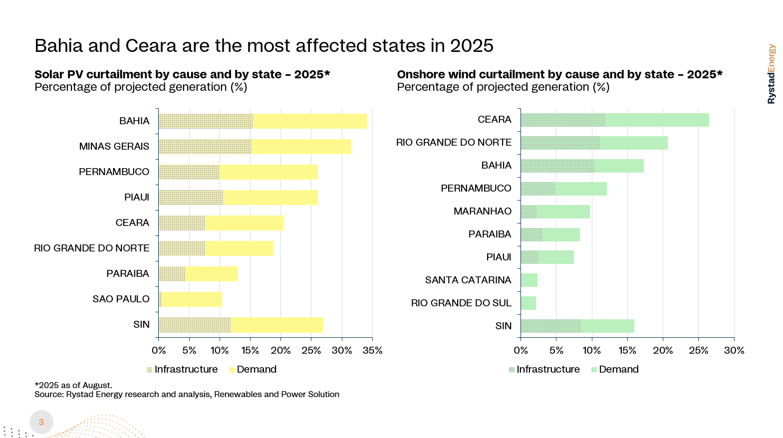 Looking more closely, Bahia is the most affected state for solar generation, with curtailment surpassing 30%. For wind, Ceará is the most exposed, already exceeding 25%. Other states in the northeast are also impacted, along with Minas Gerais in the southeast. Overall, the northeast stands out as the most vulnerable region, making new transmission lines critical for alleviating the issue.