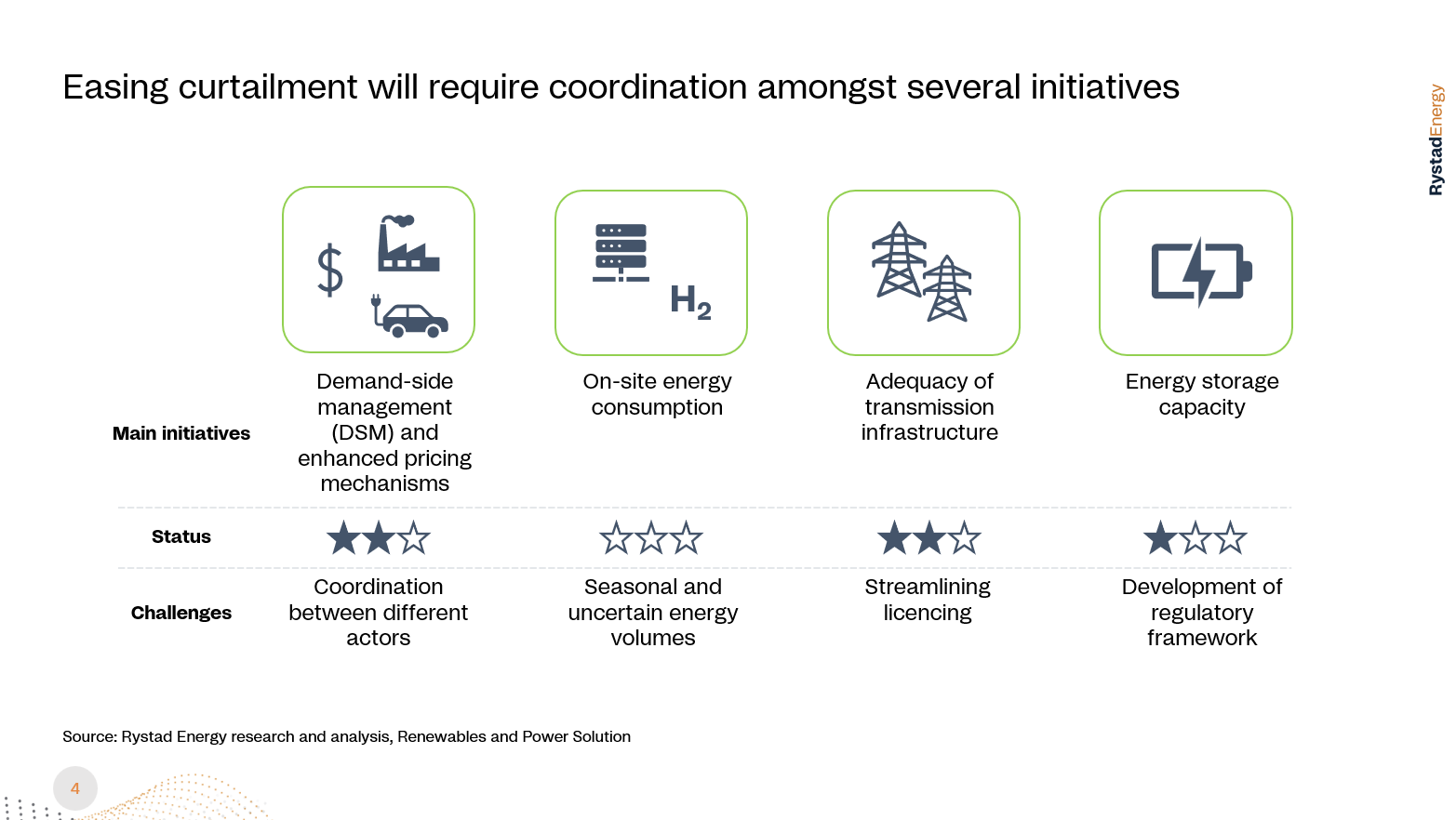 Easing curtailment will require coordinated actions across both demand and infrastructure. On the demand side, one option is to enhance pricing mechanisms for end users, incentivizing greater consumption during times when solar or wind generation peaks. Another approach is to add new on-site demand, such as crypto mining or green hydrogen production, to absorb surplus generation.