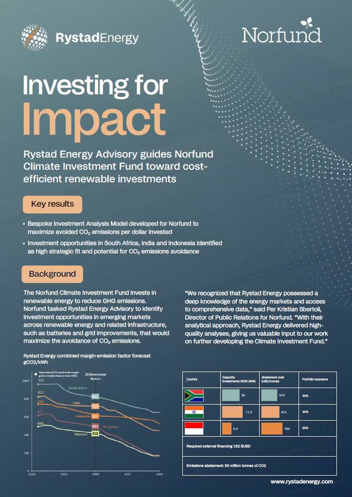 Learn how Norfund Climate Investment Fund leveraged a bespoke Investment Analysis Model developed by Rystad Energy Advisory to maximize avoided CO2 emissions per dollar invested in renewable energy projects. Read the case study here.