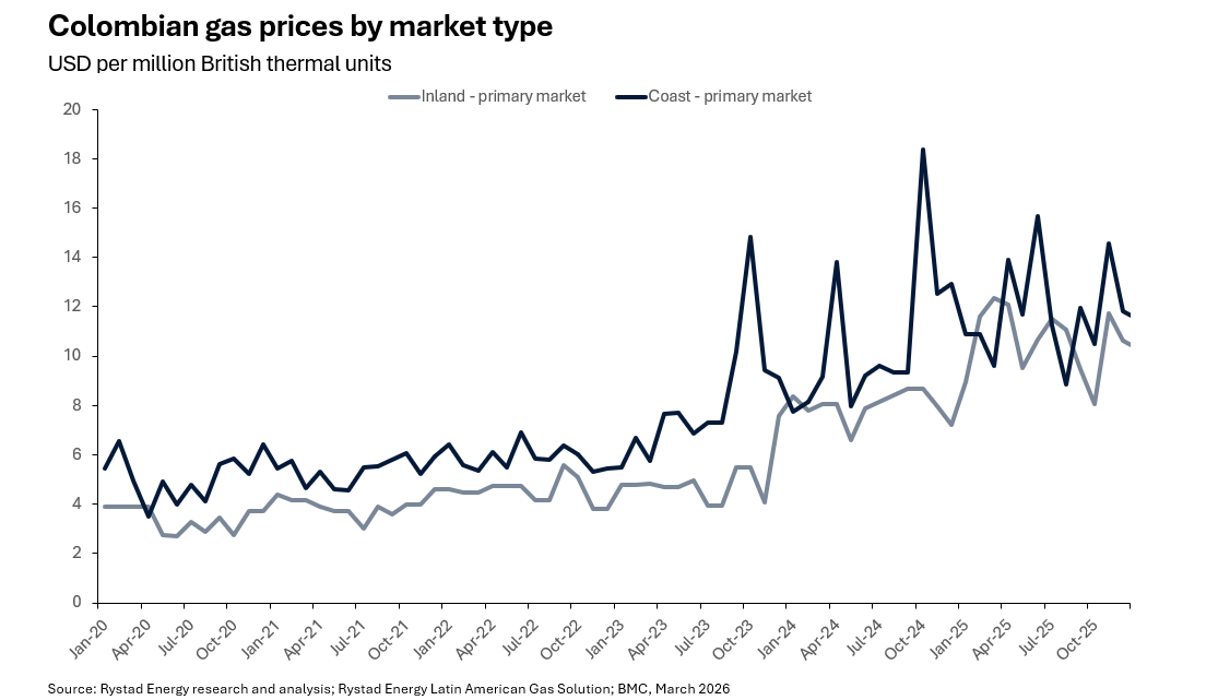 The increased reliance on LNG imports is already having effects on Colombia’s domestic prices. LNG was used only to cover peak demand but is now operating on a continuous basis, which has elevated both in coast and inland domestic prices in the past three years. The figure below shows how inland primary market gas prices have consistently surpassed $10 per million British thermal units (MMBtu) since 2025, while they used to fluctuate below the $5 mark. Colombia’s regasification infrastructure is limited, with only SPEC LNG being directly connected to the gas pipeline network, contributing 12.7 million cubic meters of capacity. New regasification projects are planned and will contribute to the country’s energy security. Furthermore, the Colombian government announced a combined plan to repair the Antonio Ricaurte gas pipeline, which connects the country to Venezuela. The pipeline has been inactive for years, and this could be another way to secure gas supply to Colombia while domestic legacy production declines.