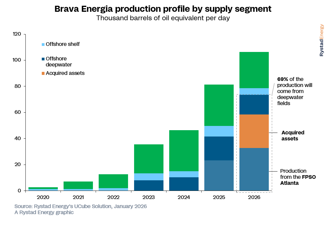 Brava Energia was formed in 2024 through the merger of 3R and Enauta, signaling a consolidation trend among companies that grew inorganically as part of Petrobras’ state-controlled non-core divestment drive. The M&A market in Brazil had a strong 2025 following this trend, with over $5 billion in transactions, the biggest being PRIO’s farm-in to the Peregrino asset, which involved buying Equinor’s stake and assuming operatorship. The Brava Energia acquisition of two producing assets bolsters its portfolio and gets 2026 off to a strong start.