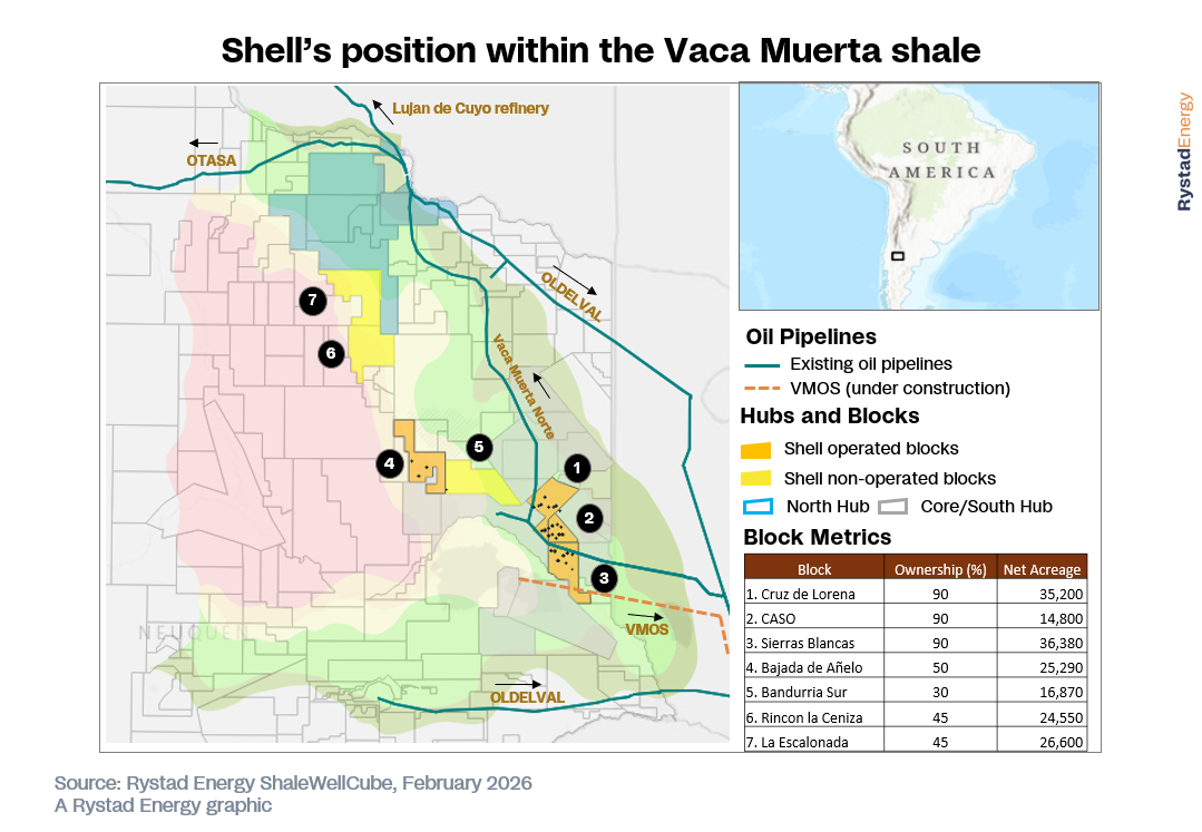 Shell has operated in Argentina for over 111 years and was an early pioneer of Vaca Muerta’s shale development. The company holds interests in seven blocks: four operated—Cruz de Lorena, Coirón Amargo Sur Oeste (CASO), Bajada de Añelo, and Sierras Blancas—and three non-operated—Bandurria Sur, Rincón La Ceniza, and La Escalonada. These assets cover about 179,700 net acres, mainly in Vaca Muerta’s oil and condensate zones. Cruz de Lorena, CASO, and Sierras Blancas are contiguous and form part of the so-called “Core Hub,” part of the basin’s mature, infrastructure-rich development zone, benefiting from proximity to key infrastructure, such as the Sierras Blancas–Allen pipeline, which connects directly to the Oldelval system.