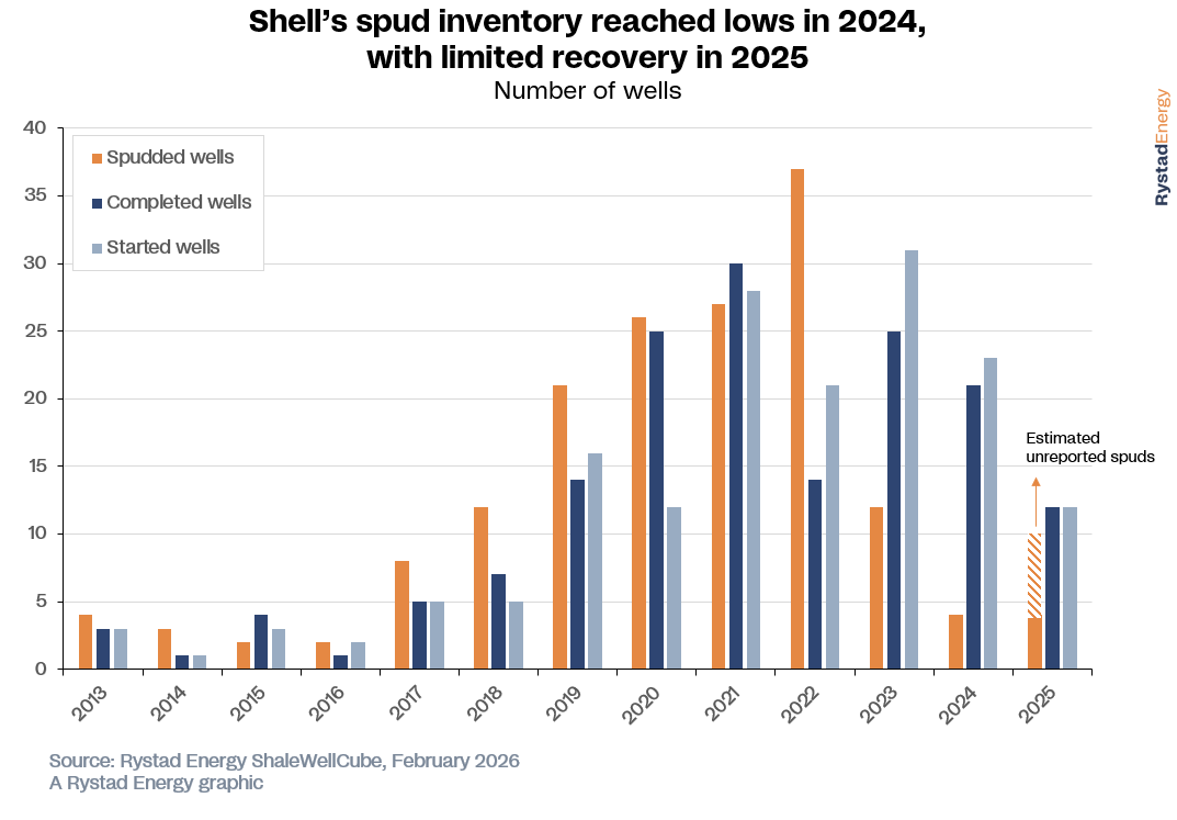 The decline in Shell’s activity levels has been particularly pronounced. Between 2016 and 2022, the company steadily ramped up drilling, peaking at 37 spudded wells in 2022. Activity then dropped sharply, reaching a low of just four spuds in 2024. While only four spudded wells are currently reported for 2025, reporting delays suggest actual activity may be closer to 10 wells. Shell typically operates one to two rigs in the basin; however, operations were further disrupted in 2025 when its primary rig, Ensign 771, collapsed during transportation.