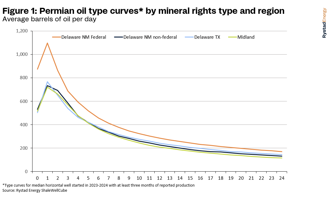Another question remains over how much increased permitting would translate to activity and output against the current pace. While prospective federal land exists outside of New Mexico, including significant portions in Wyoming and Utah, BLM New Mexico wells are most competitive for capital and therefore could be the most influenced by policy. Figure 1 shows the oil type curves for Permian wells on federal land in New Mexico, compared to non-federal wells in New Mexico, Texas Delaware wells and Midland wells. The grouping uses the median well in each category started in 2023 or 2024 with at least three months on production. Wells on federal land significantly outperform all other types, both in terms of initial productivity and two-year cumulative output, proving the importance of this segment to the producers that operate there. Please note that Figure 1 considers mineral rights rather than surface land ownership. In most cases, especially in the New Mexico Delaware, the two are highly correlated.