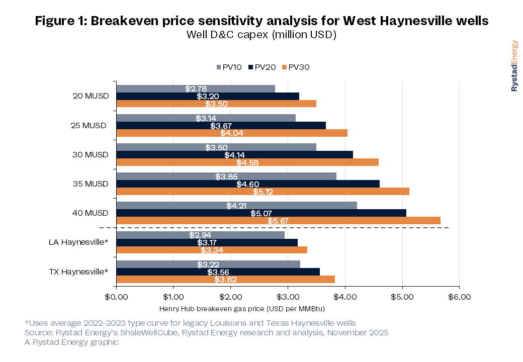 With the US in the midst of a gas demand boom driven by liquefied natural gas (LNG) projects and surge in electricity demand amid the steady buildout of data centers, the Western Haynesville has increasingly garnered attention as a promising source of future supply. The area, located roughly 150 miles north of Houston, Texas, in the Robertson, Freestone and Leon counties, has seen 60 wells drilled over the past four years. The wells are twice as productive as the median legacy Haynesville wells, but are as much as triple the drilling and completion (D&C) cost. The eventual success will come down to whether operators can continue to drive down costs in the region while replicating (or improving) the productivity of the initial wells.