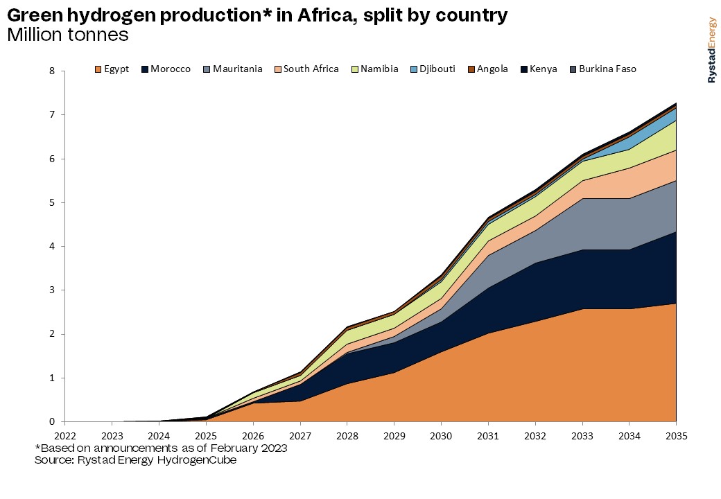 The major impediment to building these mega projects and associated infrastructure will be investment. According to Rystad Energy research, just 13 megawatts (MW) of the planned 114 GW has reached a final investment decision to date. The continent’s access to land, low labor costs and renewable power potential has been attracting attention from further afield, with Germany signing offtake deals with Namibia and South Africa. Norway has taken a different approach by providing $8 million of funding to Scatec, a Norwegian renewable company, to develop green hydrogen projects in Egypt.