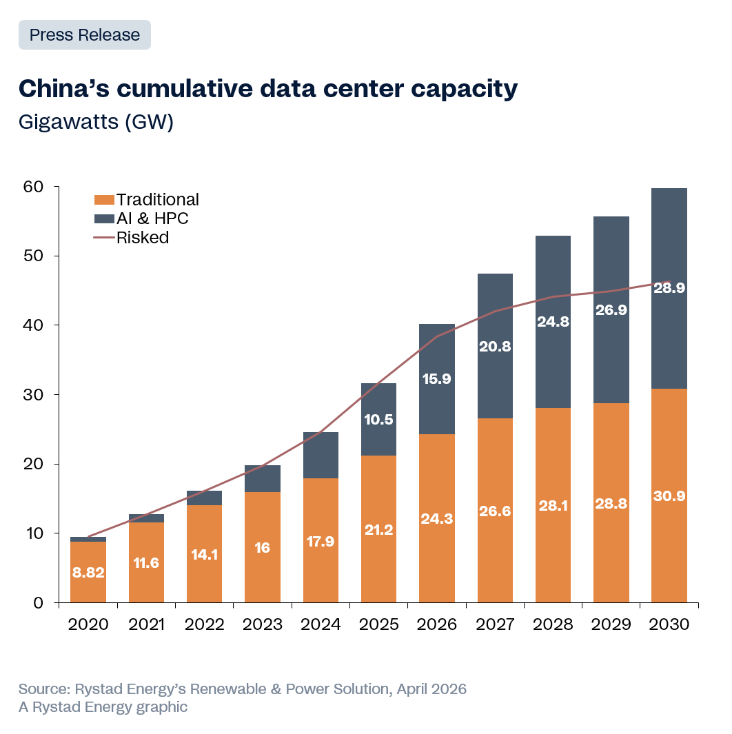 China is on course to nearly double its data center capacity within five years, with 28 gigawatts (GW) of new projects expected to come online by 2030, adding to the 32 GW already installed as of the end of last year, according to new analysis from Rystad Energy. Based on currently announced projects, with additional capacity likely to follow, this expansion is expected to lift data center power consumption to 289 terawatt-hours (TWh) by 2030. That is more than double levels seen last year and would account for around 2.3% of China’s total electricity demand. Data centers are also set to be the fastest-growing source of power demand in the country, with consumption rising at an annual rate of 19% between 2025 and 2030, driven by rapid growth in artificial intelligence (AI) and high-performance computing (HPC).