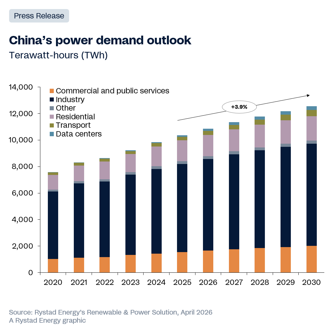 Rystad Energy expects China’s power demand to grow at a compound annual growth rate (CAGR) of 3.9% through 2030 as efficiency improves and the demand mix shifts, down from 6.5% during the 14th Five-Year Plan, when consumption exceeded 10,000 TWh last year. Within that slowing aggregate, the contrast between sectors is stark. Industrial demand growth is projected to decelerate from a 5.4% CAGR between 2021 and 2025 to 3% between this year and 2030. On the other hand, data centers, which accounted for just 1.2% of total power demand last year, posted a 38% CAGR over the past five years and are forecast to maintain a 19% CAGR through 2030, lifting their share of national consumption to 2.3% by the end of the decade.