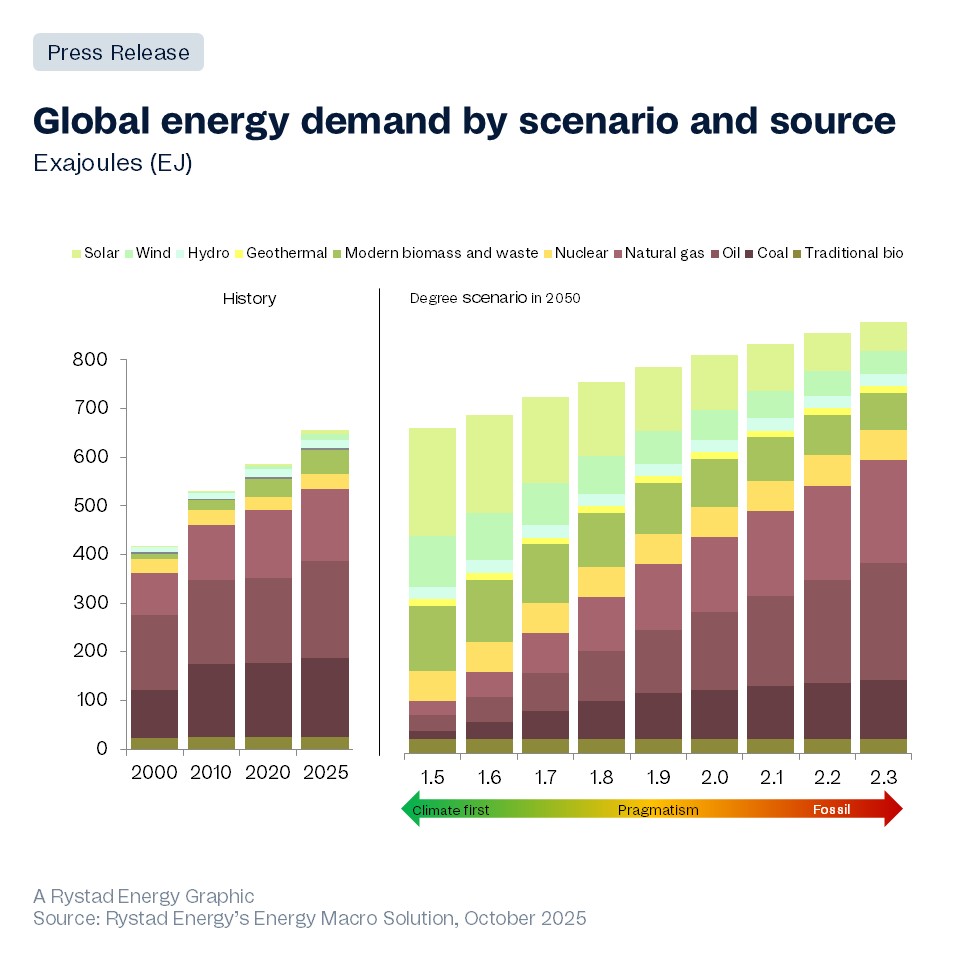 The global energy system is witnessing the next greatest transition, standing on the cusp of a new energy era championed by clean electricity and the increased adoption of electrification across the board. Rystad Energy is pleased to announce the release of its flagship annual report, Global Energy Scenarios (GES) 2025, which provides in-depth degree scenarios toward 2100 and a newly developed nationally determined contribution (NDC) scenario to 2035. Clean electricity and electrification are expanding faster than any shift in modern history, with energy sources of the next era growing from around 9% in 2015 to more than 14% this year as share of primary energy.
