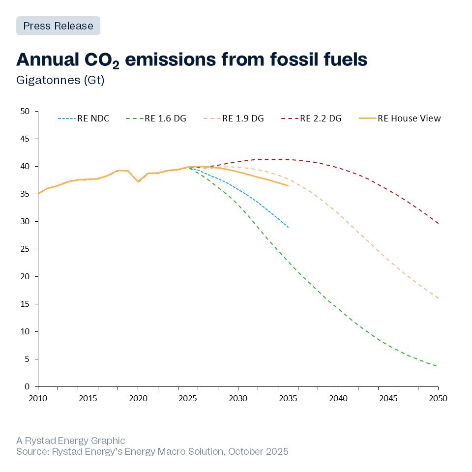Looking ahead, we can clearly outline five pathways that will shape the global energy outlook, which include the Rystad Energy NDC, 1.6 degrees Celsius, 1.9 degrees Celsius, 2.2 degrees Celsius, and the Rystad Energy House View scenarios. Global CO₂ emissions are expected to peak around 2026 before starting a gradual decline, driven by rapid renewable deployment in power and EV adoption in transport. This marks a turning point, showing that the world is moving from growth to decline in emissions. However, current NDCs remain far from sufficient to limit warming to 1.5 degrees. Even if fully implemented, they would not achieve the substantial reductions necessary for achieving the lower range of the Paris Agreement.