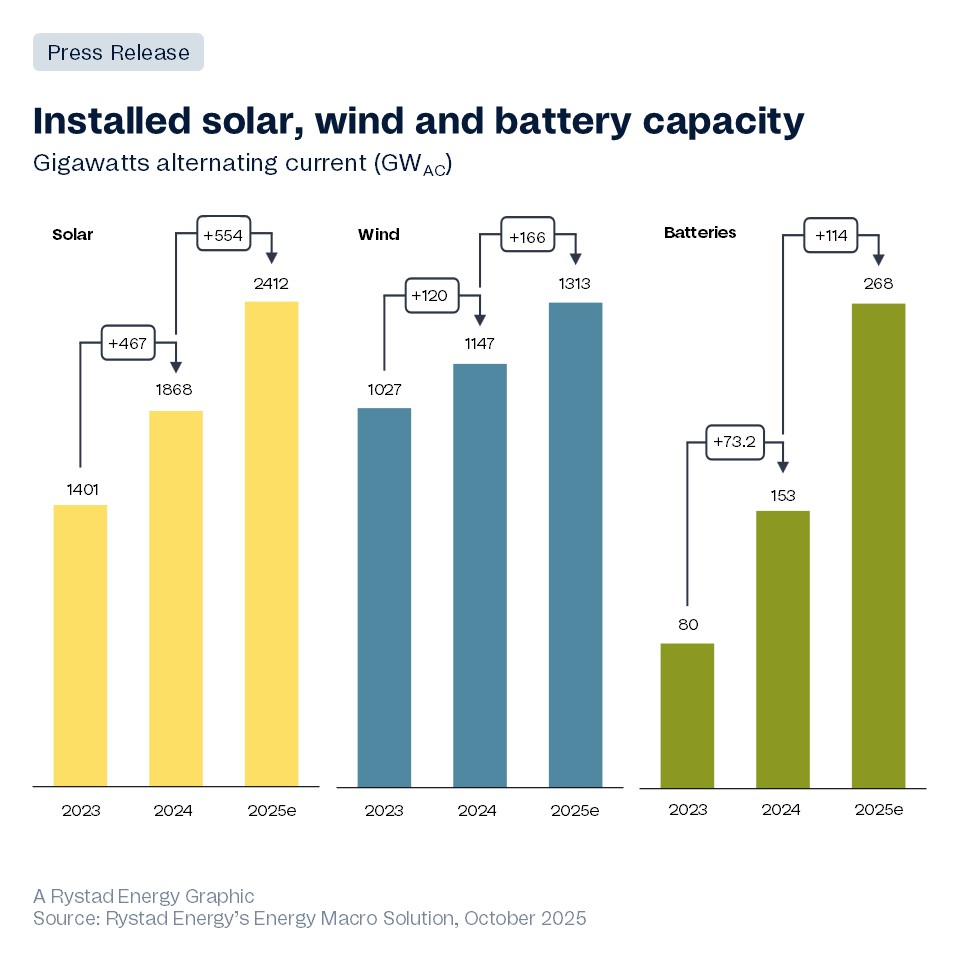 Our prediction of a 1.9-degree Celsius scenario is heavily predicated on renewable energy installations setting all-time high records and serving as the backbone of new power growth, with solar leading the pack. Solar is forecast to rise from 1,868 GW in 2024 to 2,412 GW in 2025 – a 544 GW increase that cements its position as the leader of new global power generation. Record manufacturing output, sustained cost declines, and accelerating deployment in China, India and the US drive the expansion.