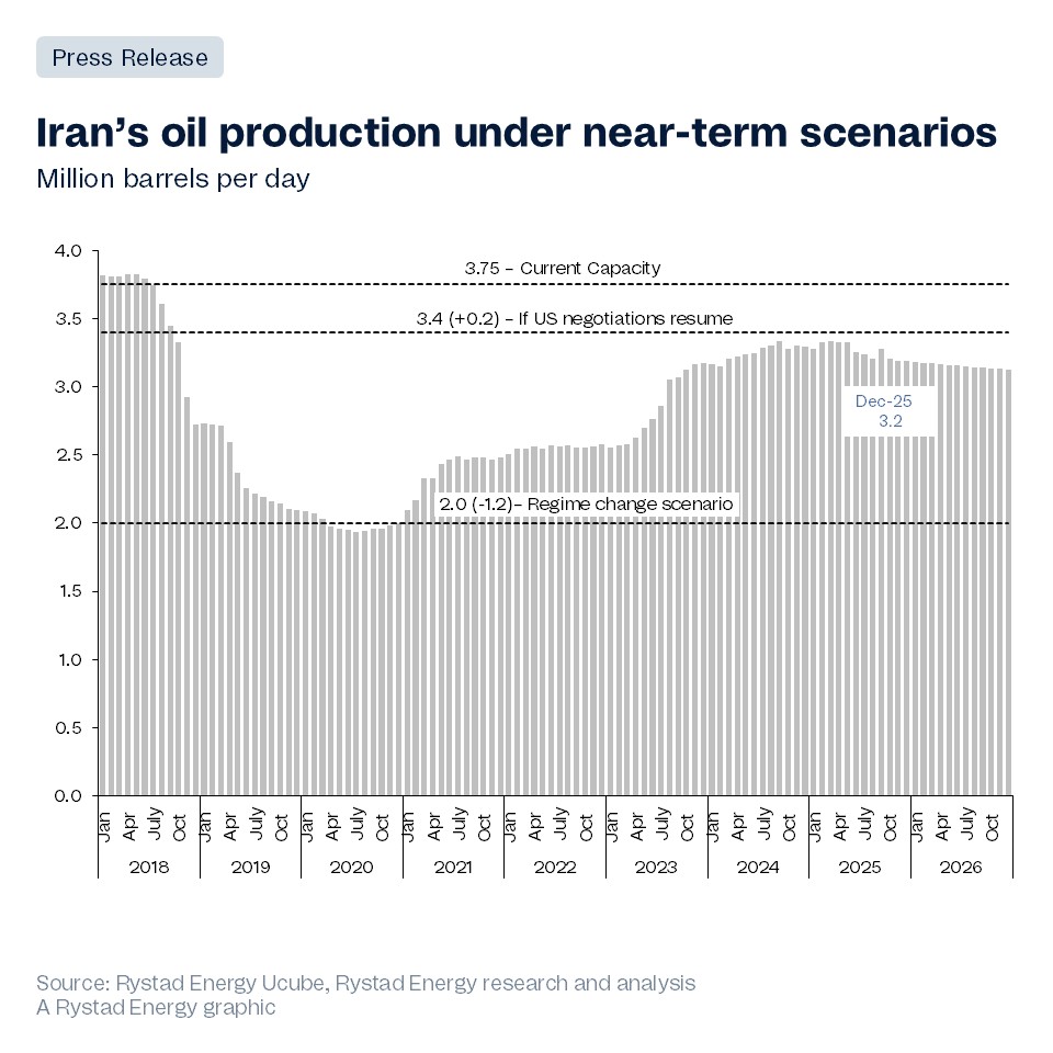 Rystad Energy’s analysis shows Iranian crude production is expected to remain stable at around 3.2 million barrels per day (bpd) this year, with limited short-term disruption to upstream operations, despite the sector facing significant financing and redevelopment hurdles. The greater risk, for now, is not physical supply loss but the geopolitical risk premium as tensions rise and uncertainty persists. With the US administration of President Donald Trump exerting maximum economic pressure on Iran’s trading partners and threatening military intervention, the Middle Eastern oil giant will likely entrench itself even further.