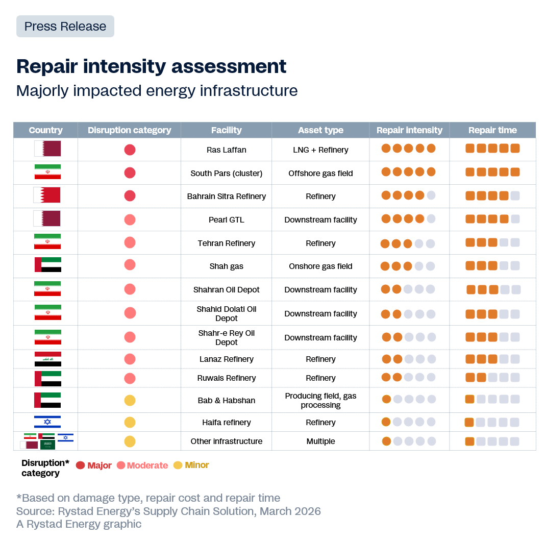 Looking beyond Qatar, neighboring Bahrain represents another distinct disruption scenario. The BAPCO Sitra Refinery was struck twice, causing confirmed damage to two crude distillation units (CDU) and a tank farm, with force majeure declared across group operations. Here, the constraint is not equipment shortages or sanctions, but the timing of the damage relative to the asset’s investment cycle. The facility had just reached mechanical completion under its $7 billion modernization program in December last year, with engineering, procurement and construction (EPC) contractors still onsite finalizing ramp-up obligations when the attacks occurred. The destruction of a newly commissioned CDU block just months after first production has eliminated novel processing capacity, delaying the revenue intended to support the recent investment. Restoring the units will likely require international contractors to be re-mobilized at conflict-inflated costs and under uncertain war-risk insurance, as the damaged assets had only recently come online.
