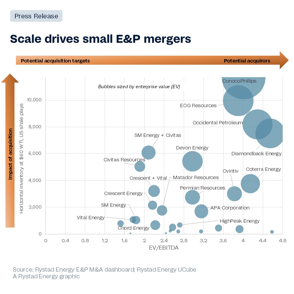 A new wave of consolidation is on the horizon for small- and medium-sized US shale producers, largely driven by an appetite for scale in a merger and acquisition (M&A) environment that is getting increasingly competitive. Scale and efficiency are key catalysts for exploration and production (E&P) players who are seeking favorable business valuations, with acquisitions emerging as a key calculation of shareholder value by rewarding operators who keep volumes high and costs low. To build scale and survive another consolidation wave, the smaller E&Ps have limited choices: either buy assets that larger players are looking to get rid of, or acquire privately owned E&Ps. Neither of these options are expected to provide the scale the players are looking for. Given the need to move higher within their segment or elevate to a top-tier profile for favorable valuations, Rystad Energy believes that smaller operators will now pursue combinations within their peer group, implying a new wave of a merger of equals.